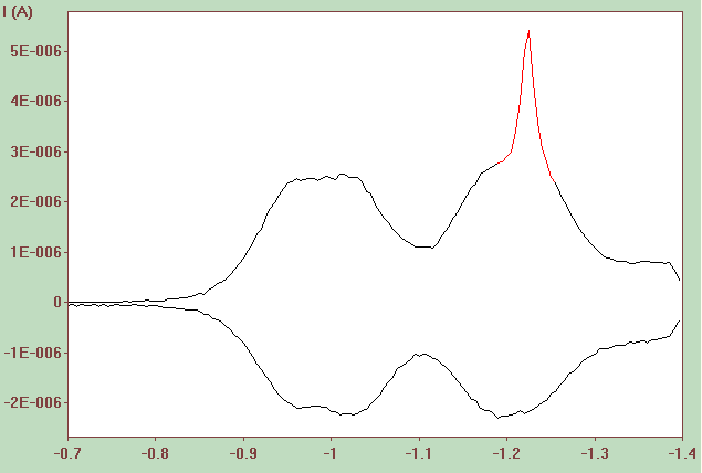 The following picture shows experimental (cyclic) square-wave voltammograms of a di-nuclear complex. The mono-nuclear species exhibits two one-electron reduction steps at about -1 and -1.2 V. In the case of the di-nuclear complex each one-electron process is split into two separate processes due to a communication between the metal centers. The potential difference representing the interaction of the metal centers is relatively small (no well separated peaks) and can be determined best by fitting the entire curves. However, the following picture reveals that the processes occurring at about -1.23V are affected by an adsorption peak: