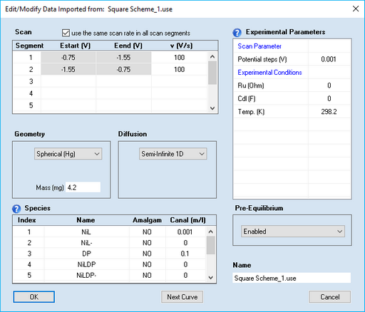 This command opens a dialog box that enables the user to view (or modify) the parameters imported from an experimental data file.
