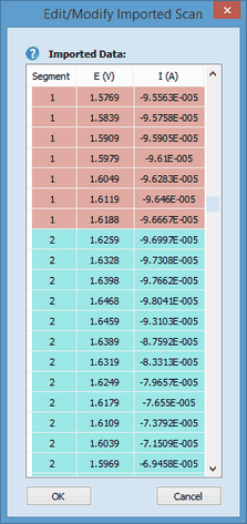Simply check whether the correct number of the scan Segment is assigned by DigiElch. Data referring to the first (third, fifth, etc) scan segment are plotted on a red brown background those referring to the second (fourth, sixth, etc.) scan segment are plotted on a cyan background. In this way the automatically assigned switching points can be easily detected. In the above example (left picture) the latter was found by DigiElch to be be at 1.6188 V. If the user wants to make the fist scan segment ending at 1.6459 V he must simply enter "1" as scan index index for the corresponding voltage/current couple as shown in the middle picture.